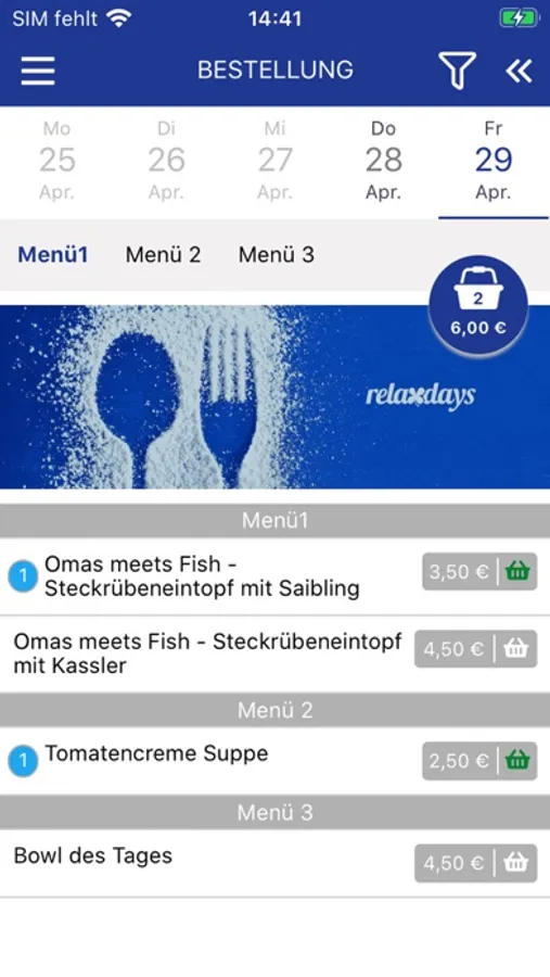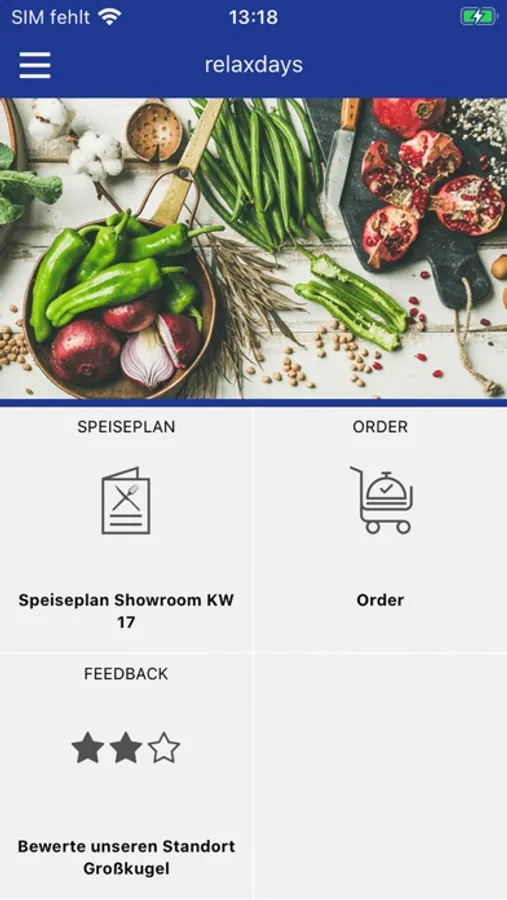 Mit der Relaxdays Kantinen-App könnt ihr Speisepläne abrufen und euer Essen bestellen. Mit der Relaxdays Kantinen-App könnt ihr jederzeit von jedem Ort den aktuellen und kommenden Speiseplan des Mitarbeiterrestaurants abrufen. Außerdem stehen euch folgende Funktionen zur Verfügung: Filtern der Allergene, Bestellungen, Einsehen eures Saldos. Installiert die App auf eurem Smartphone und registriert euch am Service Desk.