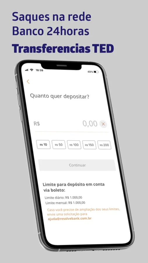 - Efetue transferência de recursos entre contas Resolve Bank sem custos;