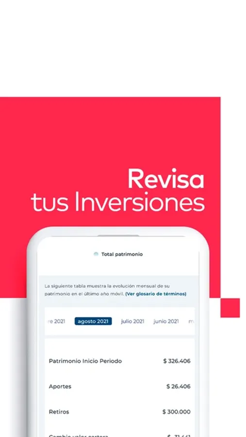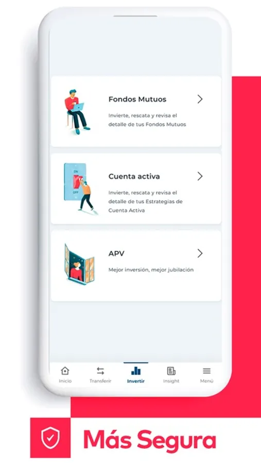 - Realizar aportes y rescates de fondos mutuos y otros productos en pocos clics.