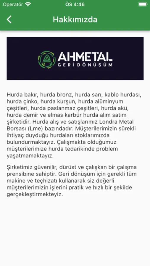 AHMETAL GERİ DÖNÜŞÜM Hurda bakır, hurda bronz, hurda sarı, kablo hurdası, hurda çinko, hurda kurşun, hurda alüminyum çeşitleri, hurda paslanmaz çeşitleri, hurda akü, hurda demir ve elmas karbür hurda alım satım şirketidir. Hurda alış ve satışlarımız Londra Metal Borsası (Lme) bazındadır. Müşterilerimizin sürekli ihtiyaç duyduğu hurdaları stoklarımızda bulundurmaktayız. Çalışmakta olduğumuz müşterilerimize hurda tedarikinde problem yaşatmamaktayız.