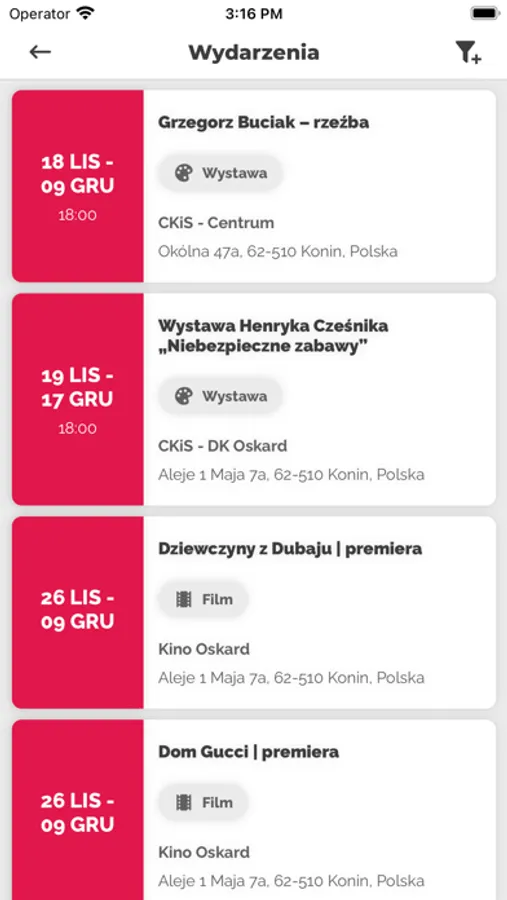 Aplikacja Epicentrum Kultury to okno na sztukę i drzwi, którymi wkroczysz do miejsc, w których się dzieje. Wiedza o koncertach, kinie, wydarzeniach, spektaklach, wystawach jest na wyciągnięcie ręki. Dołącz do nas! To tu toczy się kulturalne życie.Aplikacja Epicentrum Kultury podpowie Ci co, gdzie, kiedy w regionie konińskim i samym Koninie. Gdzie grają świetny spektakl? Jakie filmy wciskają widzów w kinowe fotele? Kto daje znakomity koncert? Epicentrum Kultury odpowie na te pytania i pomoże stworzyć Twój własny kalendarz kulturalny. Uderz z nami w miasto, miasteczko, region!Już dziś:- eksploruj Konin i subregion. Znajdź miejsca związane z kulturą. Czeka na Ciebie 50 miejscówek: kina, teatry, muzea, centra i ośrodki kultury.- chcesz wyjść dziś, w tym tygodniu, w tym miesiącu? Dowiedz się kiedy startują wydarzenia, których nie możesz przegapić. Przeczytaj o szczegółach interesujących Cię imprez.- wyrusz z nami w trasę – zaplanuj dzień po Puszczy Pyzderskiej i okolicach, śladami domów z żelaza, wiatraków, dworów. Stań na granicy zaborów i posłuchaj... ludowego śpiewaka!- otrzymuj powiadomienia o nowych imprezach, koncertach, wystawach.- kliknij w serduszko i dodaj wydarzenie do listy ulubionych, by o niczym nie zapomnieć. - przeczytaj o nas! Centrum Kultury i Sztuki w Koninie to wyjątkowe miejsce.- a co najważniejsze - pobierz porcję stale aktualizowanych informacji o życiu kulturalnym Konina i regionu!