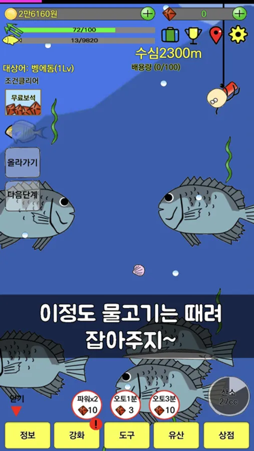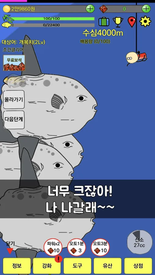 - 해당수심의 물고기를 몇마리 이상 잡으면, 더깊이 내려갈수 있습니다.