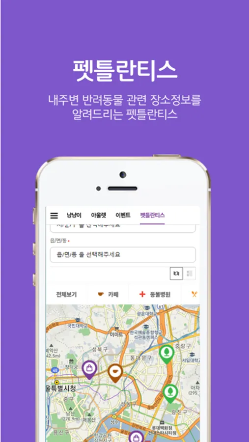 내 주변 다양한 반려동물 관련 업체정보를 지도에서 알려드려요.