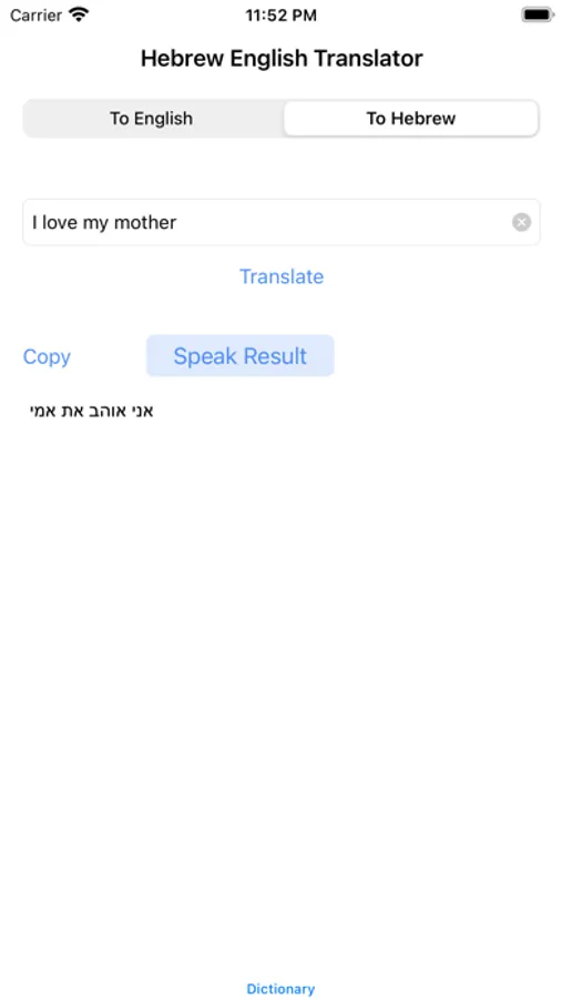 This app allows you to translate English to Hebrew or Hebrew to English, and you can choose multiple sentences. Especially when you have search result, you can click Speak Result button to hear the pronunciation of all words