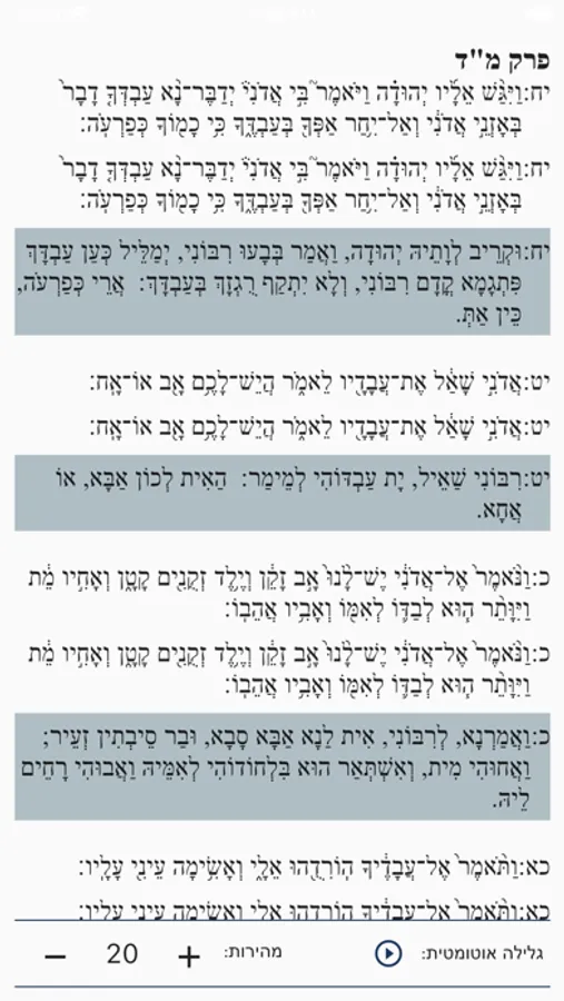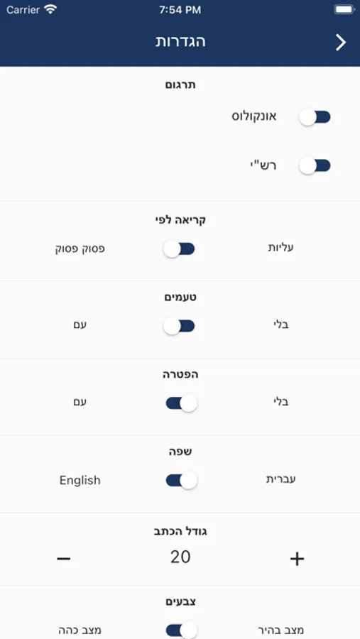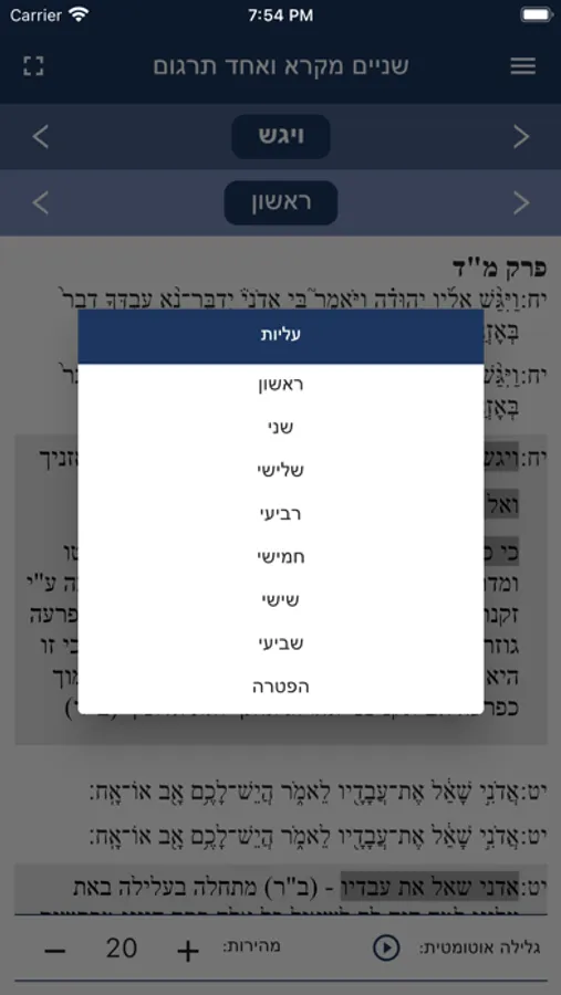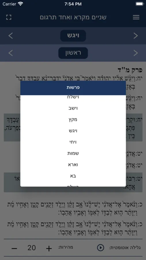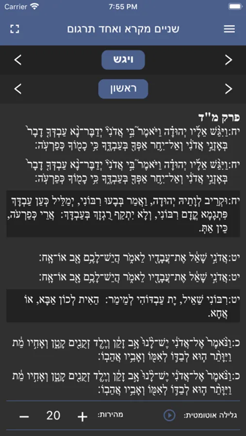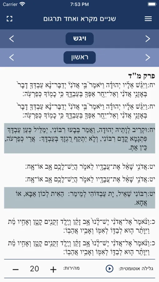 האפליקציה תציג לכם בצורה ברורה ונוחה לקריאה את הפסוקים ואת התרגום. בנוסף תוכלו לבחור בין תרגום אונקולוס לרש"י וגם את אופן הקריאה המועדף עליכם: פסוק-פסוק או מחולק לעליות.