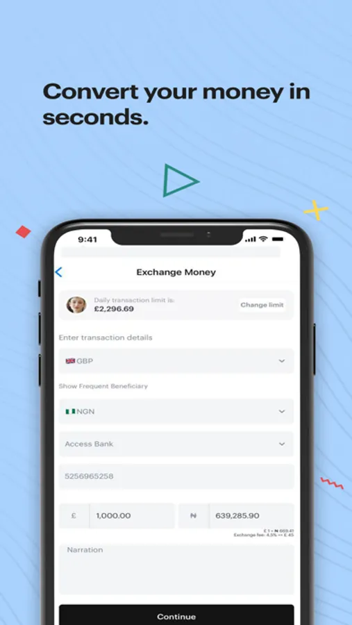 • Convert between currencies instantly, at the real exchange rate, for a super-low fee