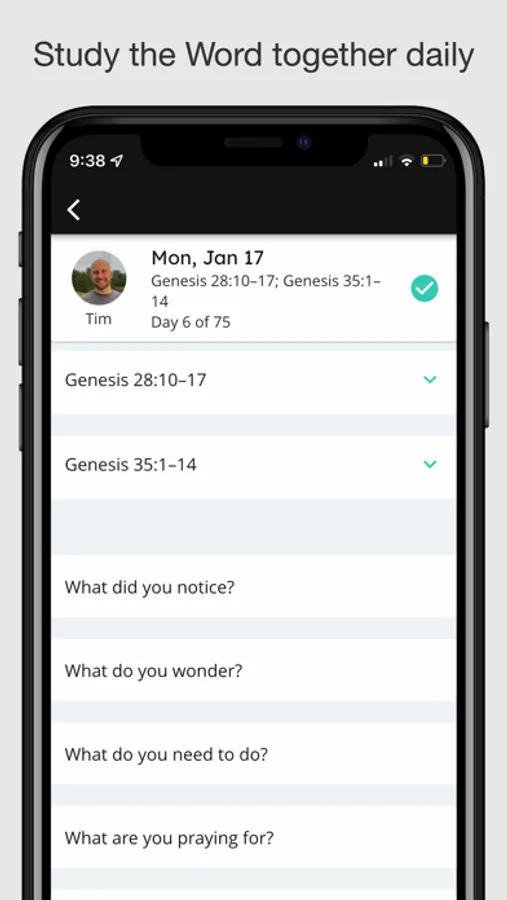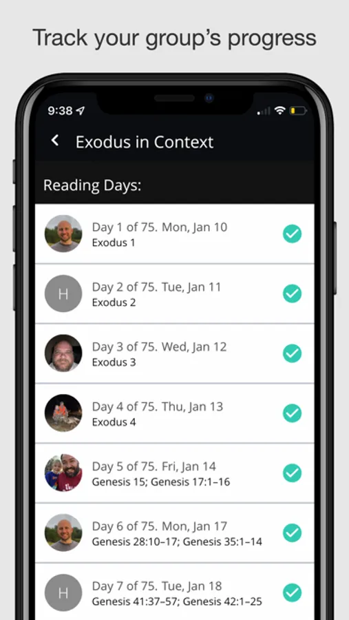 * As your group completes each day, you can use the Bible Reading Groups app to track your progress and keep everyone in your group on schedule.