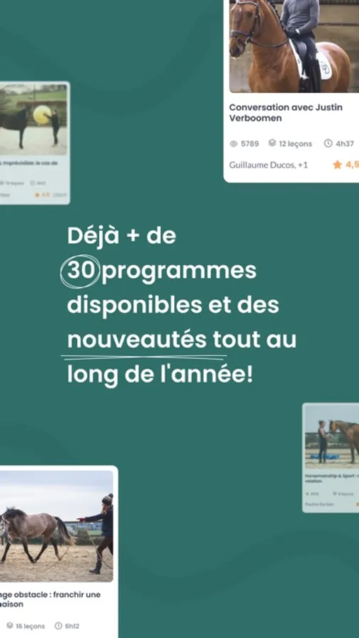 Utilisée par des cavaliers amateurs et professionnels, l’app vous donne accès à 200h de cours vidéo répartis dans 30 programmes exclusifs, créés par des experts reconnus en dressage, jumping, horsemanship et nutrition.