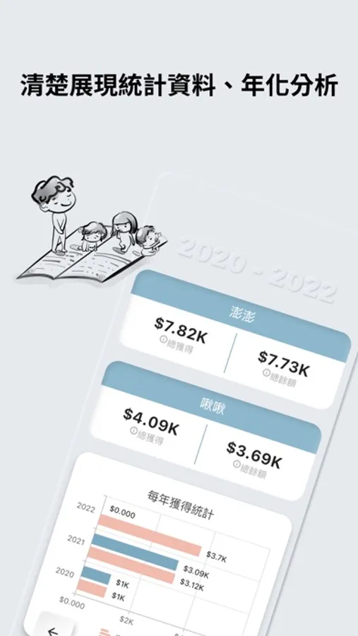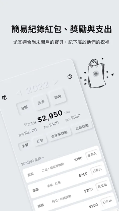每一筆來自親友、家長的紅包、獎勵贈予,都可以輕鬆快速的登記起來。