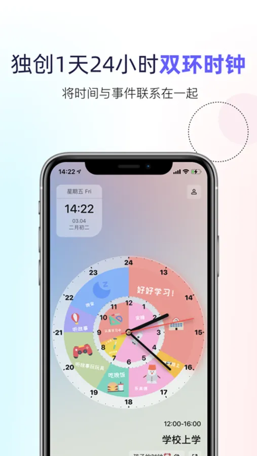 双环时钟是将科学理论结合实际生活的应用;是行之有效的时间管理工具。用户可在钟面自定义1天24小时事件安排。通过用颜色强化事件分类的形式,让用户明确自己在不同时间段应该做什么事,并且在大脑中形成对场景的条件反射性,最终帮助用户养成好习惯。