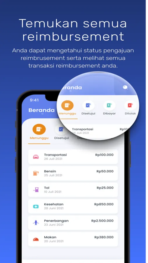 Pengguna bisa melihat dan memantau semua transaksi reimbursement yang telah diajukan secara langsung.