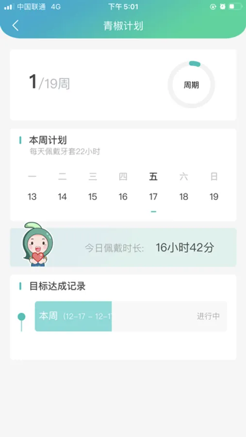 矫牙是一个坚持的过程,为保证矫牙效果,要求每天佩戴时长不低于22小时,青椒美牙APP为了帮助用户更好地完成22小时的佩戴时间,设置了打卡签到功能,如果超过时间(用户可自行设置提醒时间)没打卡,将会提醒用户及时佩戴。