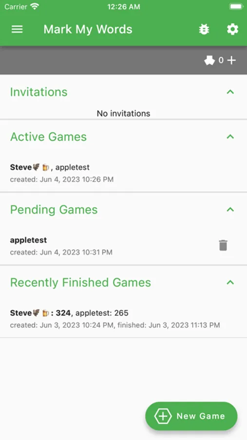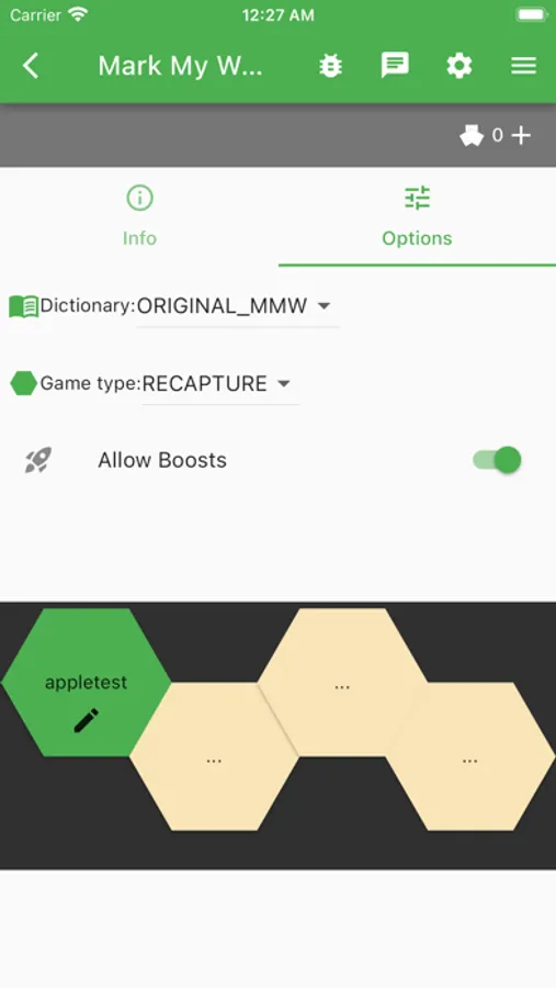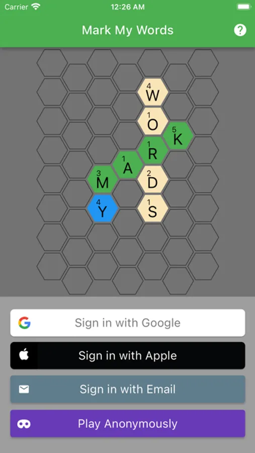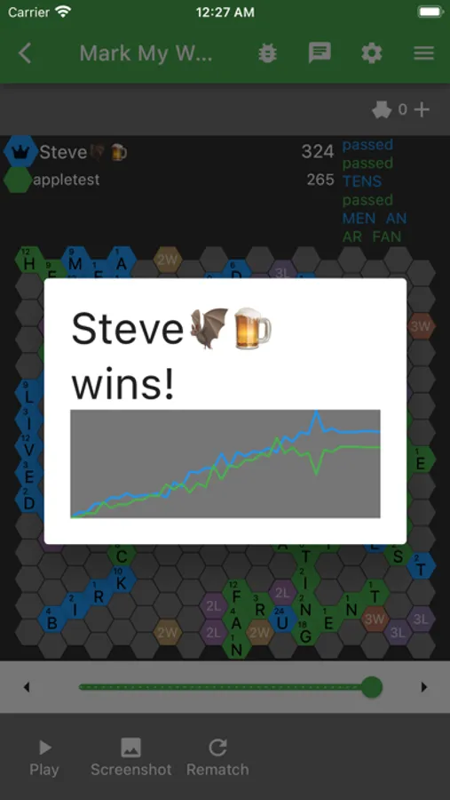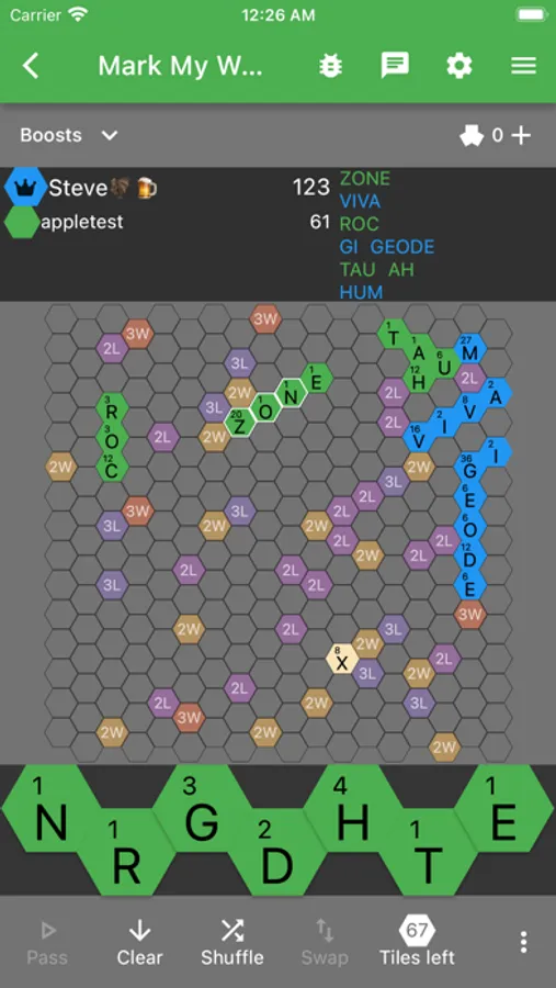 Mark My Words is an online word strategy game for 1 to 4 players. The game takes place on a hexagonal grid, on which players place tiles to form words. Tile values may be boosted by Double Letter (2L), Double Word (2W), Triple Letter (3L), and Triple Word (3W) bonuses. Each player controls the tiles for the words they play, and your score is the sum of your controlled tile values. But beware: other players can take control of your tiles by building on them!