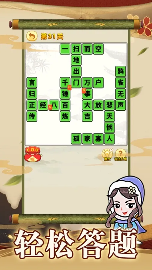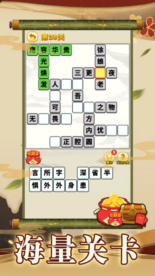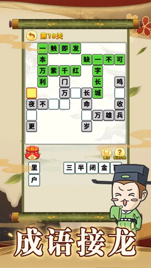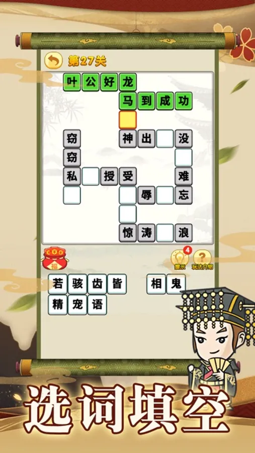 游戏玩法:依次点击将文字填入空格中组成成语,所有空格都被正确填满即可通关