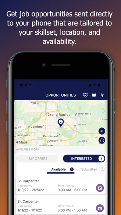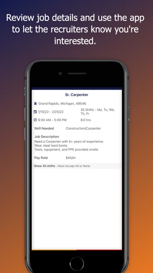 We believe in building a better America together, one local community at a time, connecting contractors and tradesmen. Use our mobile app to save the jobs you like to further review them later, stay up to date with what is going on in the job market of your trade with job matches sent to you, enter your hours worked, access your personal mobile profile to submit time sheets, sign documents and more. We are located in Michigan and Wisconsin.