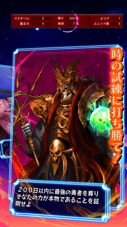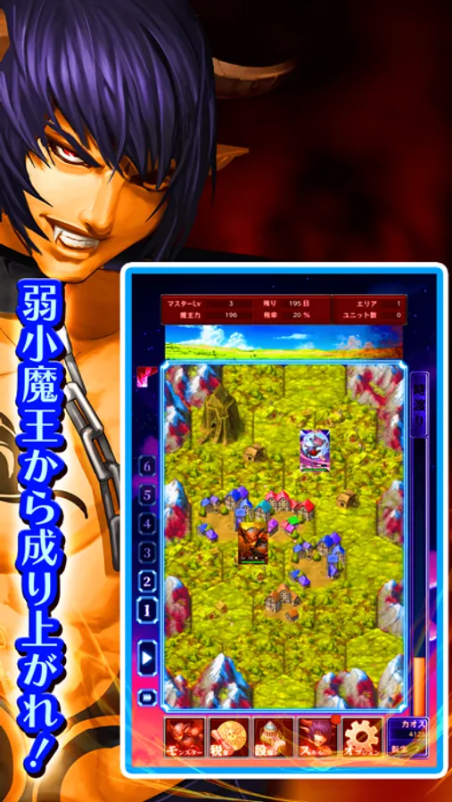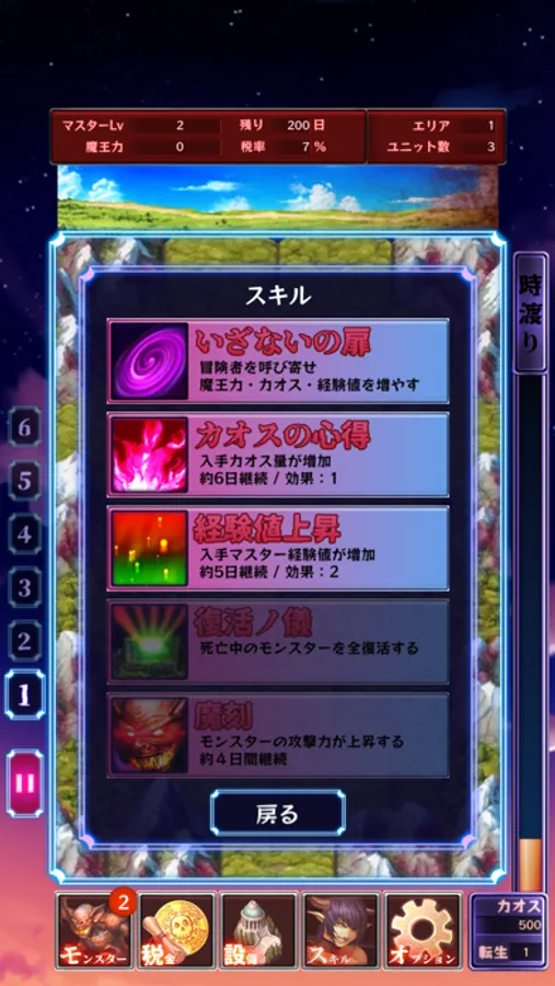 しかし時の魔神から授かった『時渡り』の力を使えば貯めたカオスと引き換えに時間を戻す事ができる。育てたモンスターや街はそのままなので、これを繰り返して最強勇者を討伐せよ!
