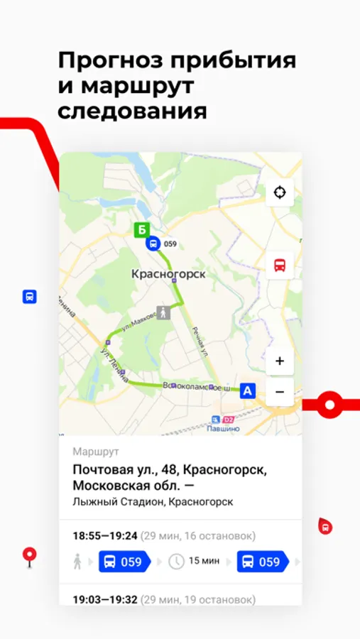 - Узнать расписание и прогноз прибытия на нужную остановку;