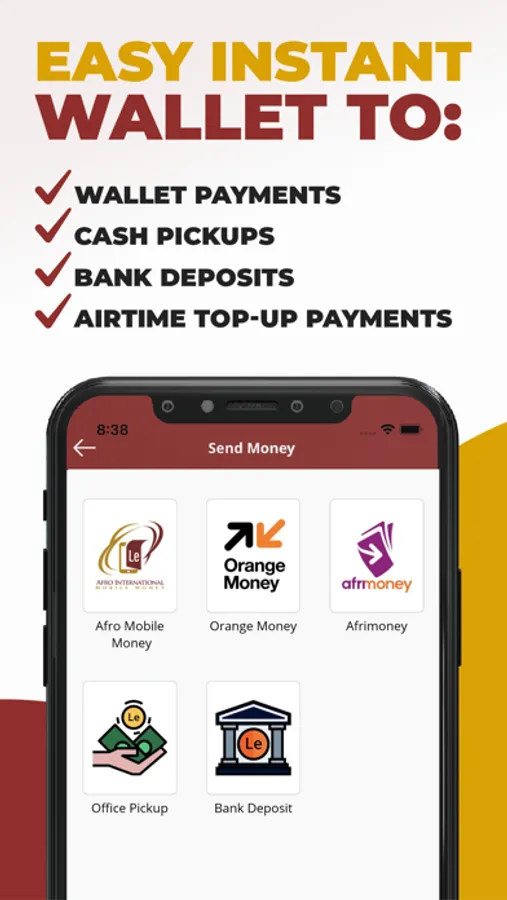 •Easy Instant Wallet to Wallet payments, Wallet to Cash Pickup, Bank Deposits, Airtime Top-up payments.