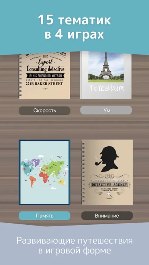 Наше приложение - это не заумные термины, сложные научные области и пугающие своей сложностью задания. Мы постарались сделать его максимально полезным и понятным, но в то же время эффективным для широкого круга пользователей, решающих ежедневные задачи. Тренировка памяти, внимания, концентрации, увеличение скорости принятия решений и развитие интеллектуальной базы - вот бонус, который вы получите от регулярных занятий в нашем приложении.