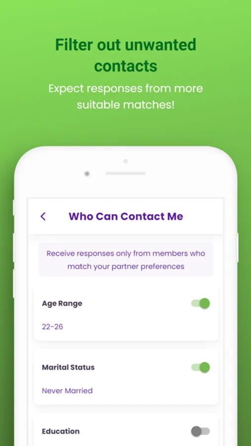 Premium “Who can contact me” feature will give you peace of mind to receive responses only from suitable matches with your preferences. With this feature you can set conditions such as age range, marital status, mother tongue, education, language and residing in.