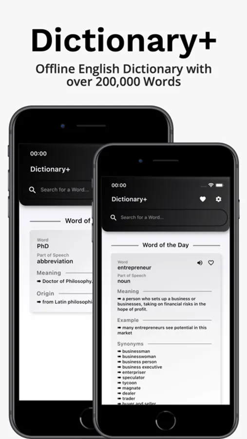 Free and Offline English Dictionary with over 200,000 Words available with No Ads or In-App Purchases. It comes with a sleek, interactive and customizable graphical user interface which can be modified to your liking.