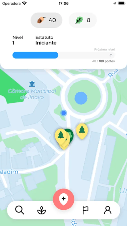 Cada utilizador tem acesso a um mapa pessoal onde pode adicionar plantas segundo a sua localização. No mapa pessoal, o utilizador tem acesso ao Menu Principal; ao botão de Adicionar uma planta ao mapa; e ainda, ao sistema de Pontuação, onde pode visualizar os pontos adquiridos até ao momento e o seu nível de progresso; e por fim, ao sistema de Contagem de Plantas, onde pode analisar as plantas identificadas até ao momento por tipo de planta.