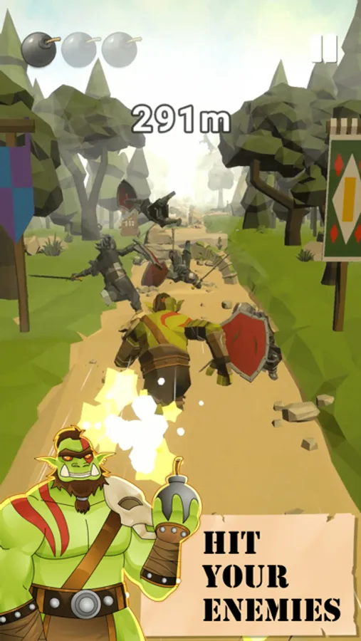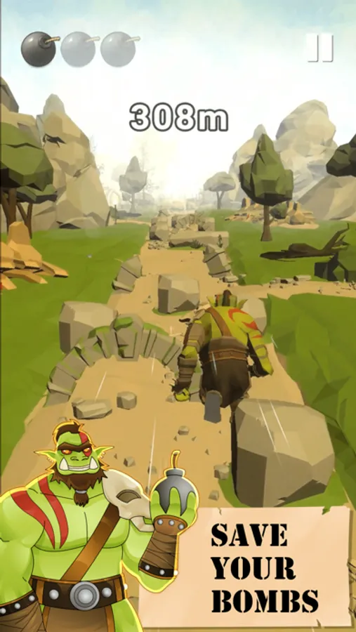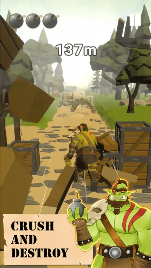 You are a brave orc who destroys and breaks everything in his path. Having collected a bunch of bombs, you run forward to DESTROY.