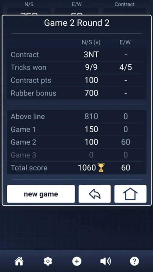 At the end of each round, the winning bidder's score contract points if they met or bettered their contract, or give “Undertrick” penalty points to their opponents. The “Rubber” is won by the team with the highest score after the first team wins two out of three games. The games are won when one team wins 100 contract points.