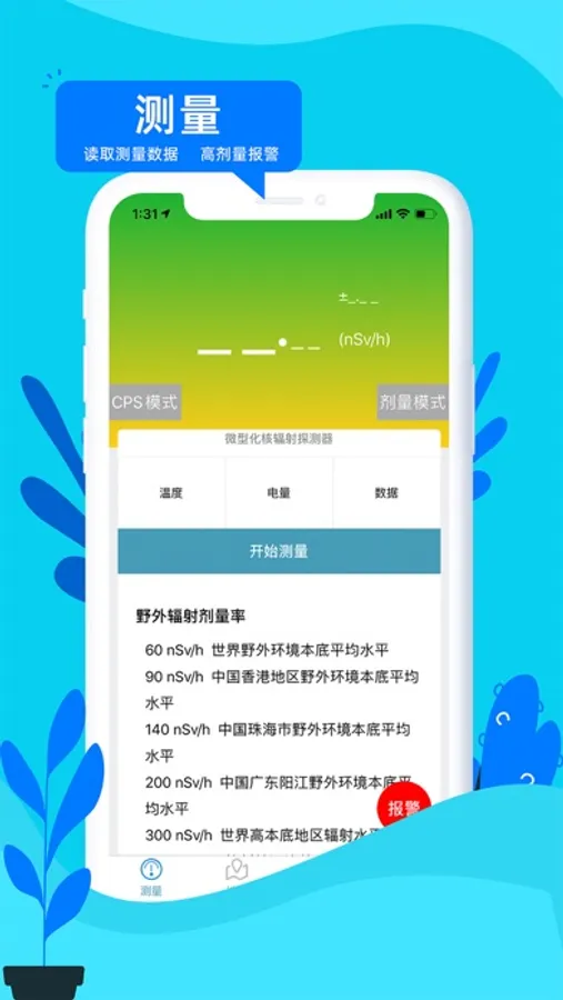 智能客户端中心功能是辅助微型化辐射探测设备的使用,通过蓝牙协议与设备连接,进行操作质指令的发送和数据读取。智能客户端的主要功能模块测量可进行设备搜索、操作命令发送、测量数据采集、测量数据显示和存储,之外还具有历史数据和个人中心功能。