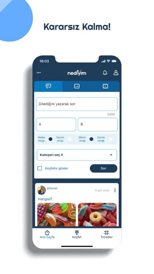 NeDiyim? kararsız kaldığınız her konuda karar vermenize yardımcı, yeni nesil eğlenceli bir sosyal medya platformudur. Tek yapmanız gereken merak ettiğiniz konuyla ilgili fotoğraf ya da video paylaşıp bir anket başlatmanız.