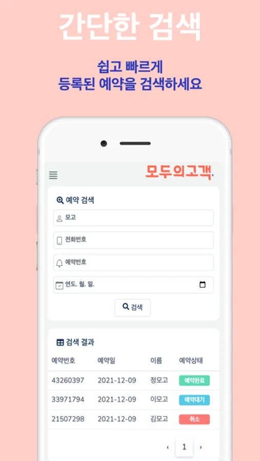 저장된 예약과 고객데이터를 검색하여 볼 수 있습니다.