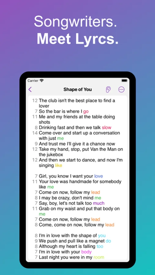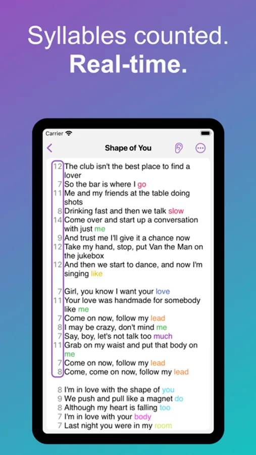 Have you ever needed to ensure a line in verse 2 matches the syllable count in verse 1? Gone are the days of manually counting on your fingers. Lyrcs provides instant syllable counting for every line in your lyrics.