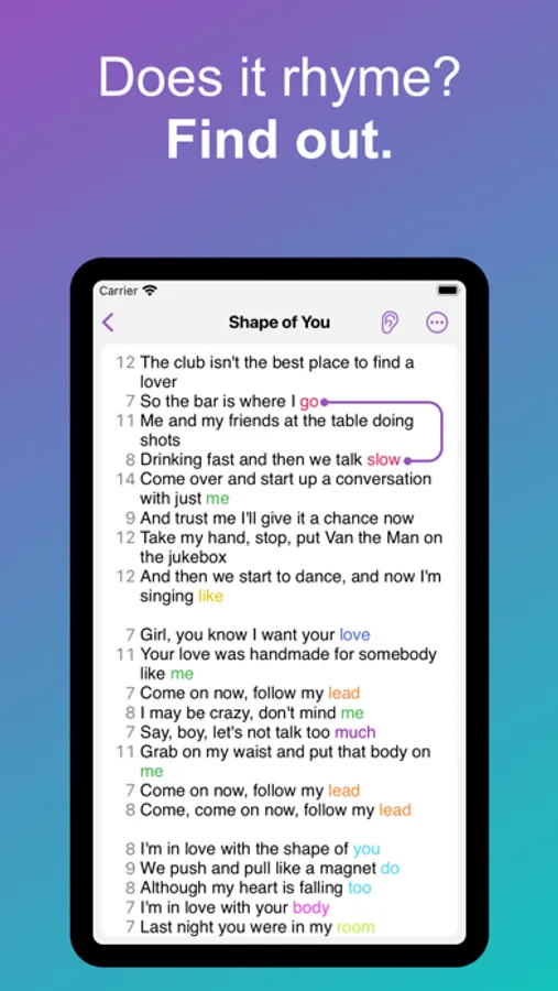 No need to keep track of which words rhyme at the end of a line, Lyrcs will do that for you. This allows you to instantly judge if maybe you've spent too much time on a single rhyme group.