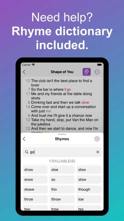 Gone are the days of opening a browser and checking rhymezone to find that perfect rhyme. Lyrcs contains a built in offline rhyme dictionary so results are shown to you in an instant.