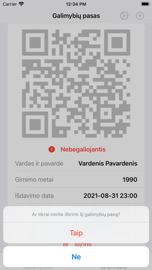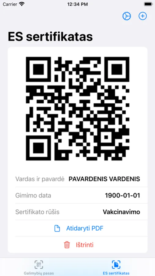 Pastaba: siekiant užtikrinti duomenų patikimumą, programėlėje galima naudoti tik originalius galimybių paso arba ES sertifikato dokumentus PDF formatu.