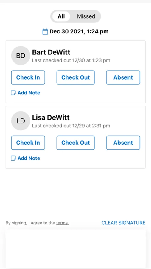 The user performs the check-in or check-out transactions or transactions by indicating which child is checked in, checked out or absent by tapping the appropriate buttons on the screen. Then the user provides a signature and submits the record by tapping Submit.