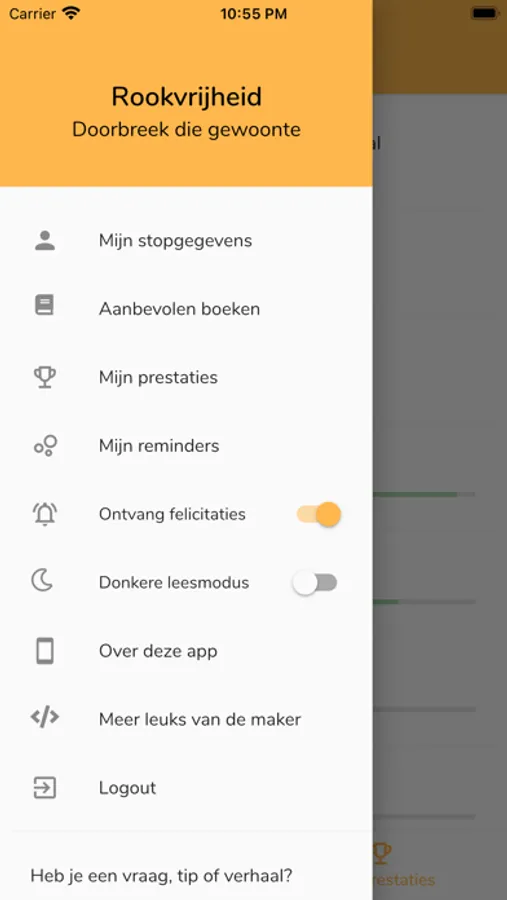 Stoppen met roken is een topprestatie. Elke sigaret die je niet rookt is een uitdaging, en elke keer dat je dat lukt is een overwinning. En die overwinningen op jezelf mogen best wel eens gevierd worden. Deze app helpt je daarbij! 100% gratis, altijd optimistisch en zonder betweterig gezeur.