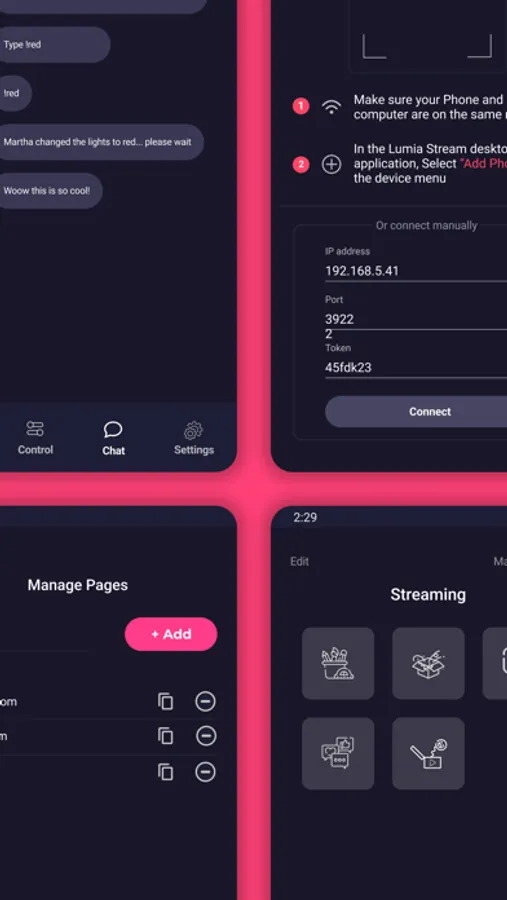Lumia Stream Link connects to the Lumia Stream Desktop app and gives you full mobile control over your setup.Change your lights with the click of a button, change your OBS setup, send a chat message, or even use your device as a virtual light.You can do it all with Lumia Stream Link