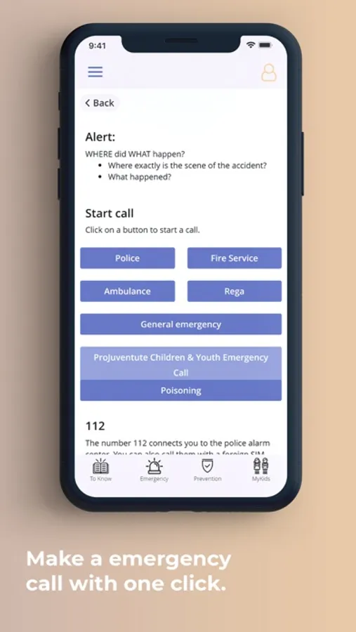 Ein Ratgeber - Die App zeigt dir dir zu jeder Verletzung, wie es zu verarzten ist. Im Notfall kannst du den Notruf direkt über die App wählen.
