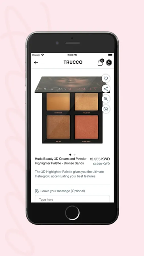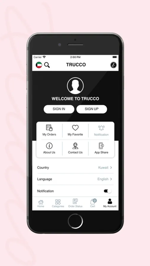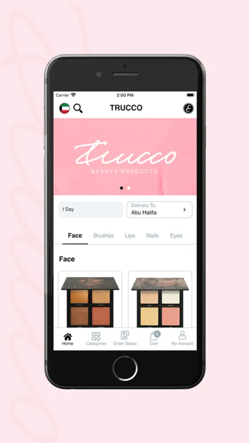 Trucco application is the best way to collect your cosmetics needs. All you need to do is: open the application, then click on the suitable category, all the available products will appear to you, add what you want to your cart. Finish the process by filling the wanted information to have your order like: the preferable payment method and the delivery information.