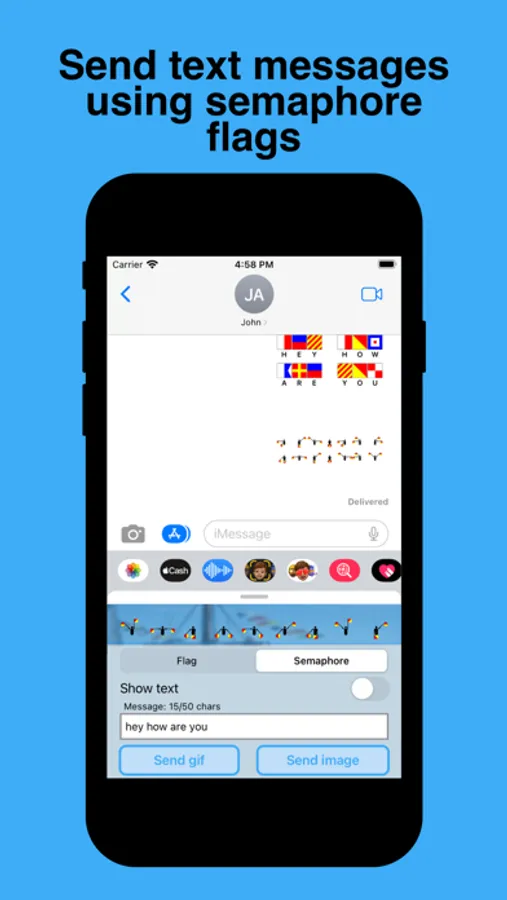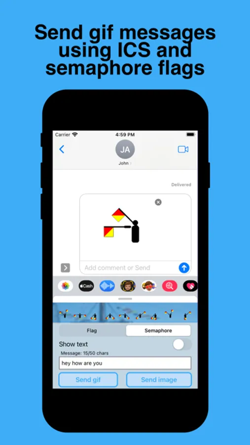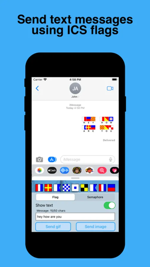 ICS Messenger allows you to create and send messages using ICS (International Code of Signals) flags or semaphores. Include the text for the flags or hide it in order to communicate with a secret code. Messages can be shared as a animated gif or as an Image.