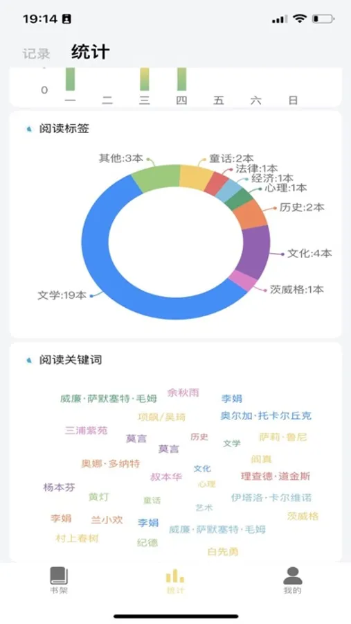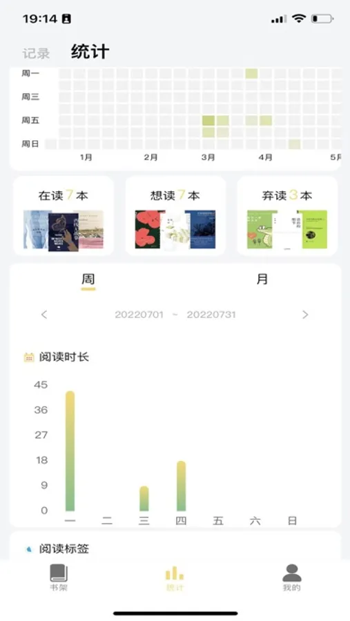 【数据统计】清晰呈现阅读时长、阅读天数、阅读类型、阅读状态、笔记条数等。