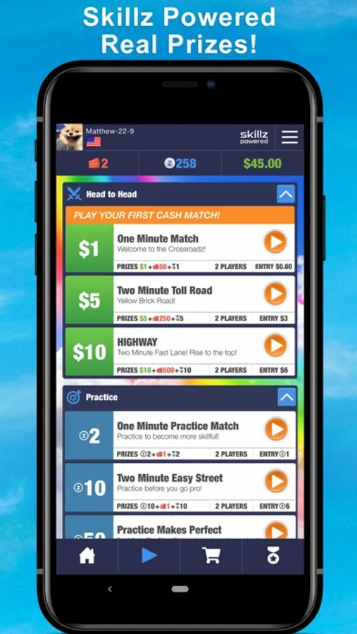 *Real prize tournaments are not available in the following states: AZ, AR, CT, DE, LA, MT, SC, SD, and TN. If you don't live in a real prize-enabled region, you can still play for fun with virtual currency. User Terms and Conditions: www.skillz.com/legal