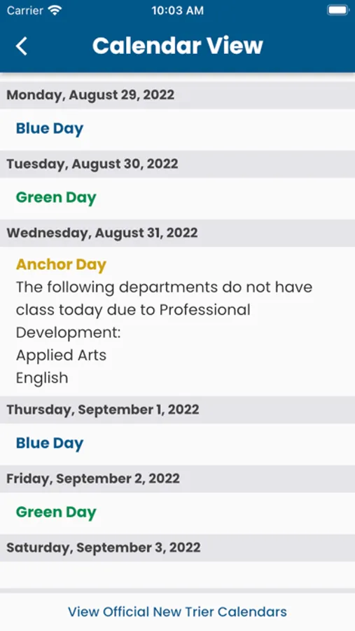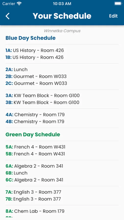 This app is designed to help you easily identify whether it is a Blue or Green Day in New Trier High School's Block Schedule and the current period during the school day. Additionally, the app includes Personalized Learning Day information for the second semester schedule adjustment.