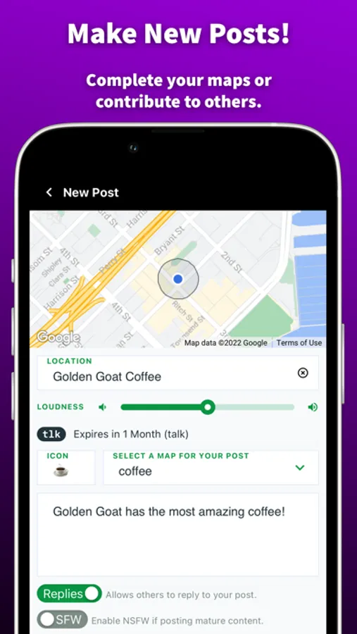 Use it to find food trucks, garage sales, good coffee, and more! Plan your next friendly scavenger hunt or leave surprise notes for your loved ones.