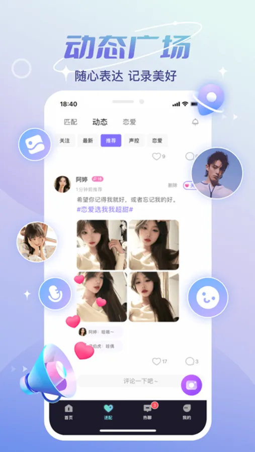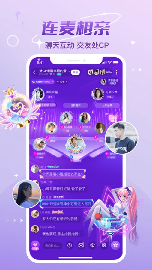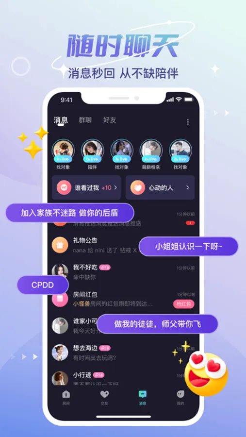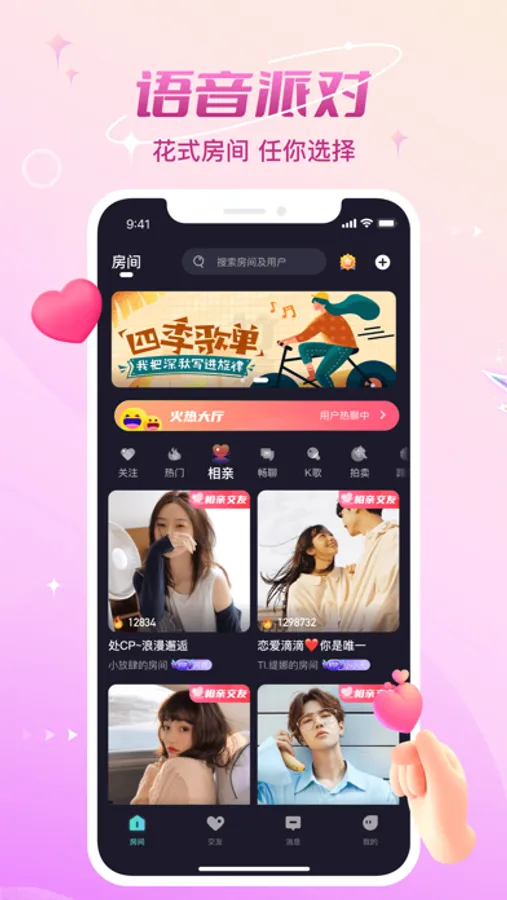 相亲交友,在线畅聊,树洞,连麦,暖心陪伴,兴趣社交,语音房间内在线斗图,是戏精还是快乐团宠?等你探索~