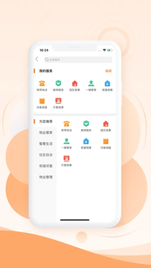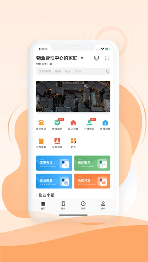 【智慧生活】提供物业服务功能模块,如报修报事、物品借用、常用电话等。