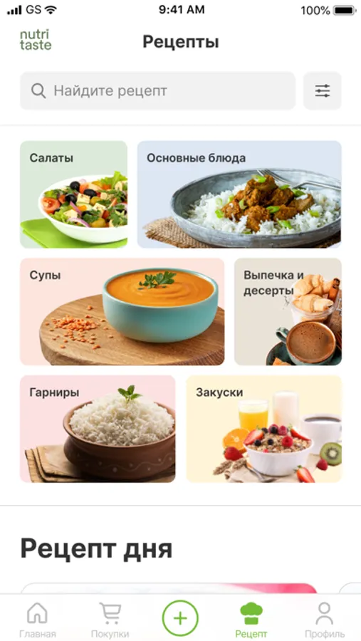 - NutriTaste. База блюд, где у пользователя имеется возможность просмотра каждого отдельного блюда, имеющая в себе полное химическое описание и его пошаговое приготовление с использующимися ингредиентами. Если вам понравилось составленная нами диета, то рецепт блюда Вы можете сохранить в “Избранное”