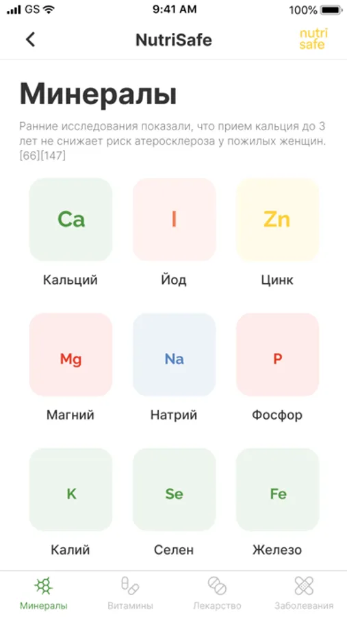 - NutriSafe. Научно-обоснованная часть приложения, использующая зарубежную литературу, где у пользователя имеется возможность просмотра различных БАДов и ознакомиться с их кратким описанием, эффективностью использования и лечение заболеваний, побочных действий и лекарственным взаимодействием.