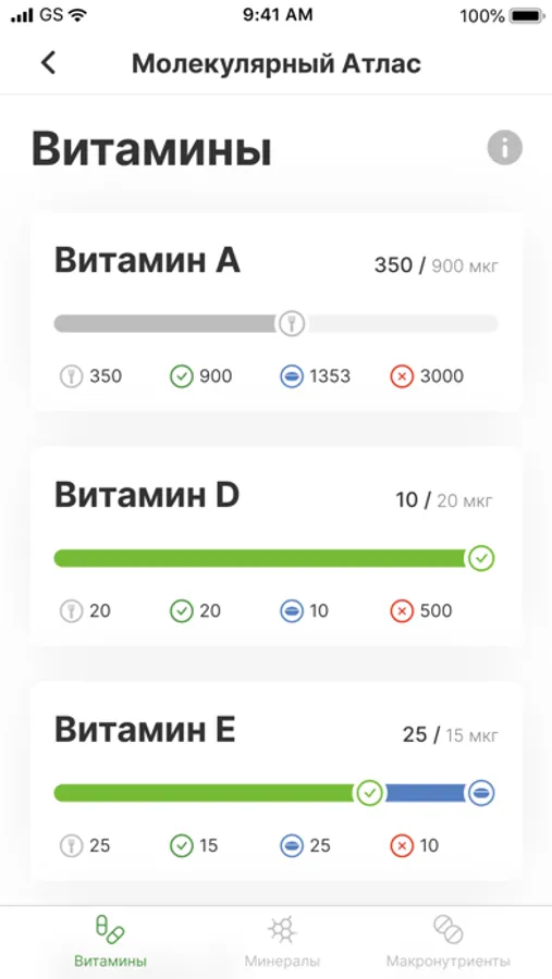 - NutriTest или Молекулярный атлас. Раздел, где у Вас имеется наглядная возможность просмотра вашего дневного потребления нутриентов. Также отображается количество нутриентов, рекомендуемое к употреблению, сколько данных нутриентов у вас сгенерировано в сегодняшнем меню и критический уровень, превышение которого не рекомендуется. Даже похудение не означает, что Вы имеете право пренебрегать количеством рекомендуемых нутриентов.